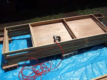 置き場は…自室の軒下。雨が降ったら…ちと辛い。週末作業でパネル16枚ほどタタキます。